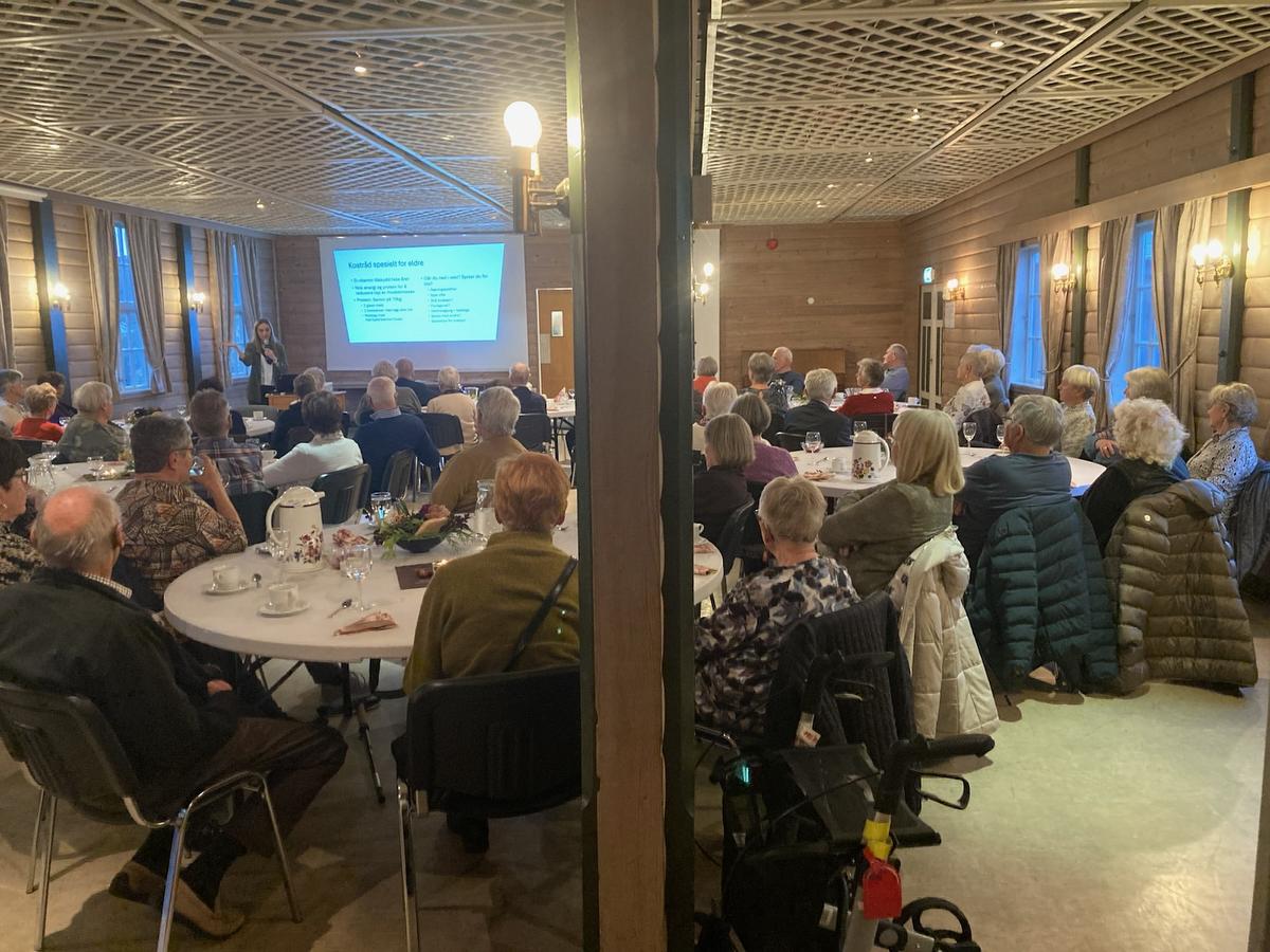 Onsdag 22.oktober var det tid for ny Seniormiddag, denne gangen med skikkelig høststemning. De fremmøtte fikk servert nydelig biffgryte med potetmos levert av Hannes Kjøkken. Iselin Skaara fortalte om Friskliv Dalane og ga nyttig informasjon og inspirasjon om hvordan en kan holde seg frisk og sunn som senior. "Fokus må være på det som er friskt og å oppnå flest mulig friske leveår!"Over 50 påmeldte pratet, spiste og koste seg sammen på Seniormiddagen som var den tredje i rekken. Til dessert ble det servert nydelig multekrem.